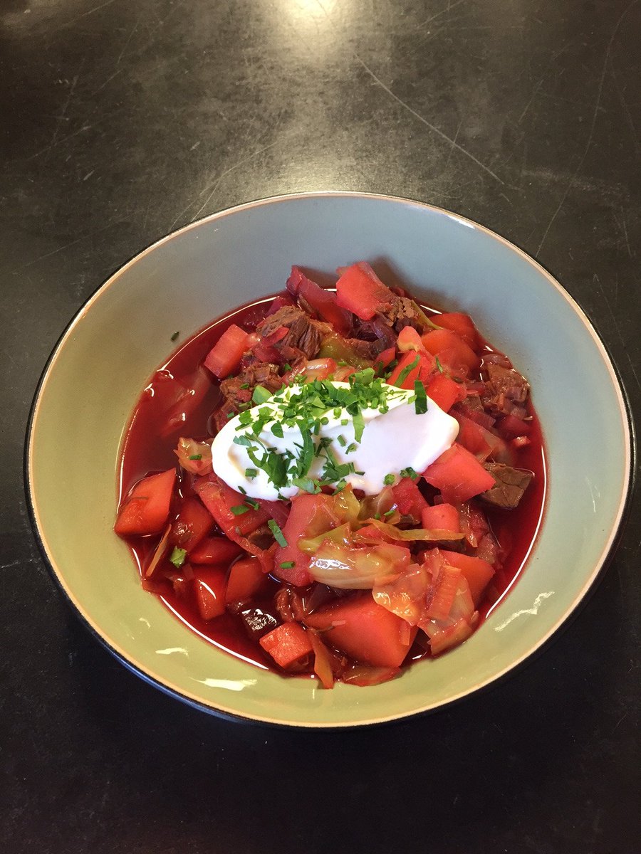среда: Borschtsch, Schtschi (Weißkohlsuppe mit Kartoffeln,Paprika) und zum Nachtisch Milchreis Romanov