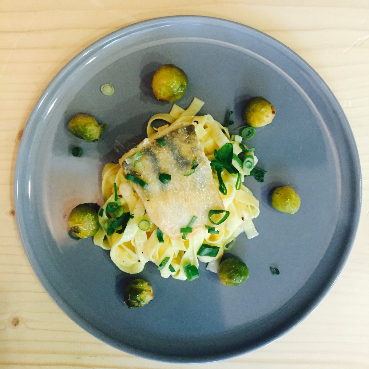 Es ist nie zu spät für Zander! Auf Pasta/Rosenkohl. Dazu Hüttenkäse mit karamellisierten Kumquats!