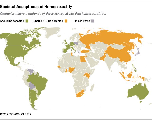 Should society accept homosexuality? In green countries, most people said yes In orange countries, most people said no http://www.pewresearch.org/fact-tank/2017/12/08/global-snapshot-sex-marriage/ …pic.twitter.com/jheOrwcvgE