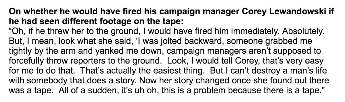 Also on Hannity, Trump said he really would've fired Lewandowski if he threw Fields to the ground. pic.twitter.com/WjkMjz12Ey