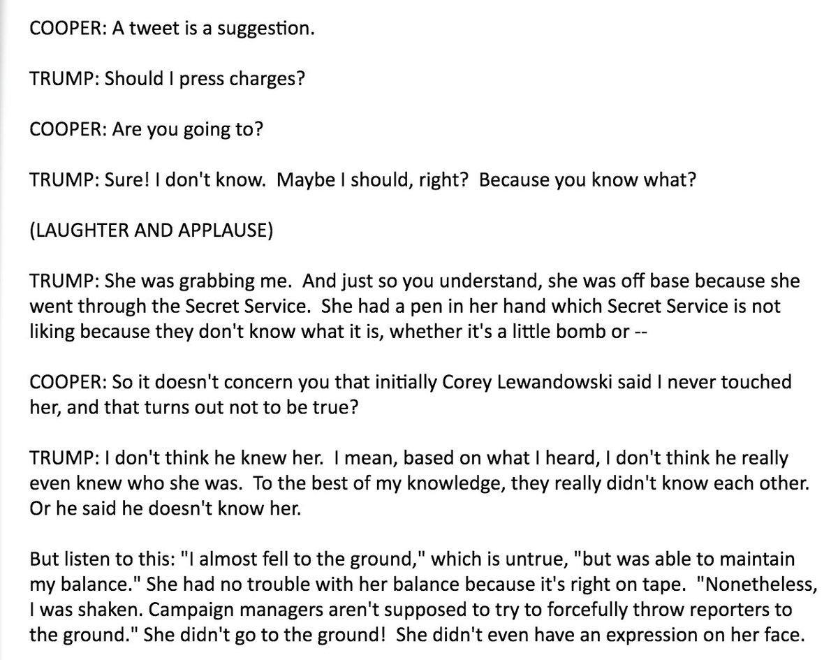 On CNN, Trump openly mocked Michelle Fields, as he has all day. Cooper repeatedly tries to press him. pic.twitter.com/nBTqZmZ63q