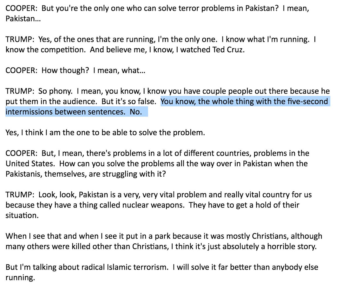 This is Trump's answer to CNN on why he alone can take on terrorism. He attacks Cruz for...his speaking style?: pic.twitter.com/JRwx3hhn8T