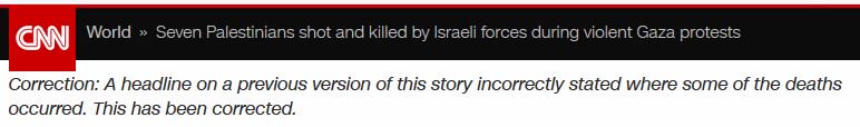 רשת CNN מדווחת בכותרת על "שבעה הרוגים בעזה". בעזה? לא. חלקם נהרגו במהלך חדירה לשטח ישראל, חלקם בשטח ישראל, אחרי שכבר חדרו. פתאום זה נשמע קצת אחרת, לא? ביקשנו מהם לפרסם תיקון. פרסמו.