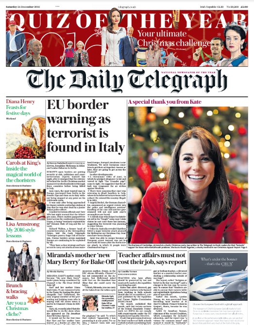 Tomorrow's Daily Telegraph front page today: 'EU border warning as terrorist is found in Italy'pic.twitter.com/XMkHsPHdwM