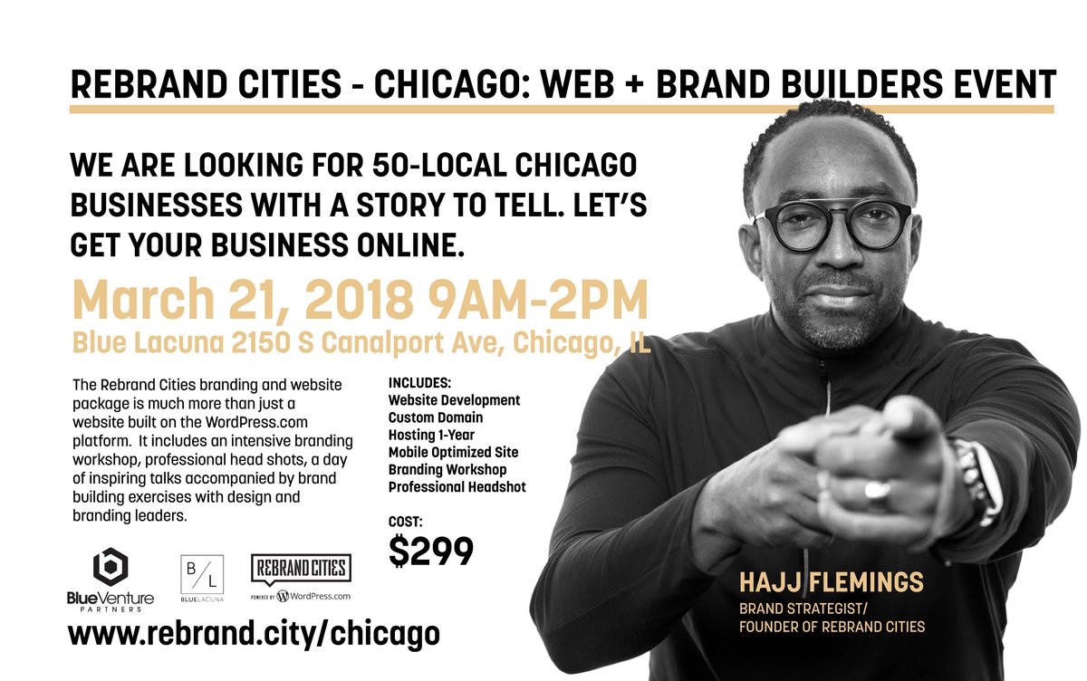 @rebrandcities has partnered with@wordpressdotcom and@thebluelacuna for a day of web development and branding on 03/21 in#Chicago. It is time for a brand makeover... new website + brand. Limited Spots http://rebrand.city/chicago pic.twitter.com/P5bfheyzeN