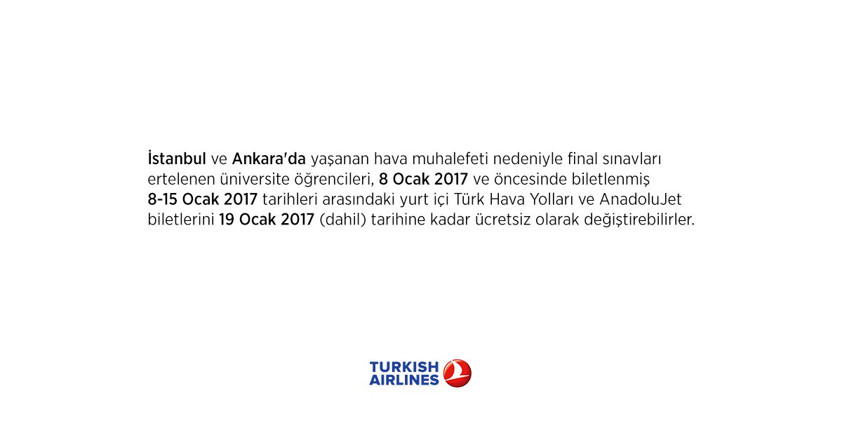 Hava muhalefeti nedeniyle final sınavları ertelenen üniversite ögrencileri yurt içi biletlerini 19 Ocak'a kadar ücretsiz değiştirebilirler.pic.twitter.com/HAm9pMaorc