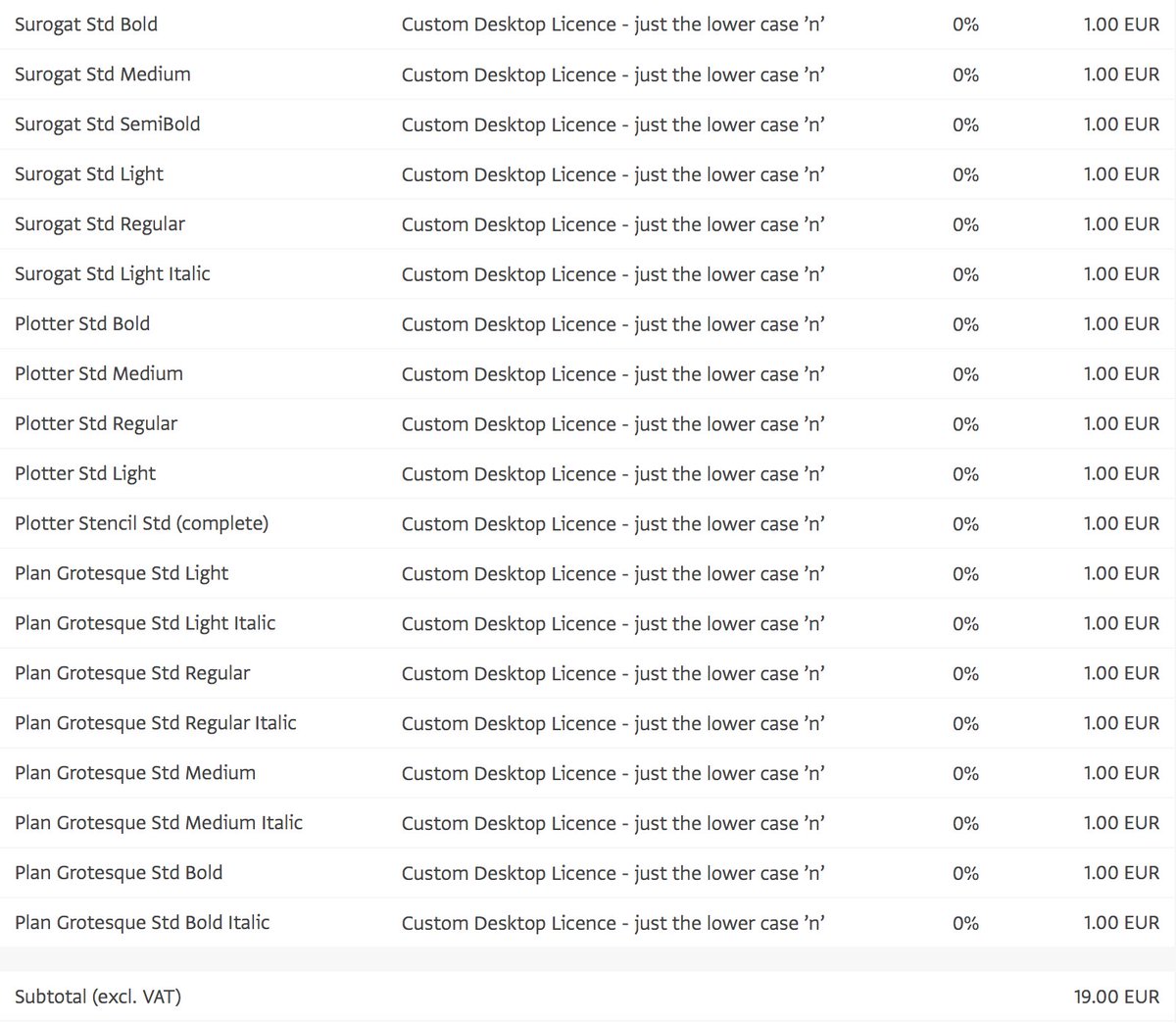 Surprisingly, we’ve sold some ‘n‘s and ‘o‘s. Get in touch, if you’d like to upgrade them to the full fonts (by paying the difference in price). Thanks.