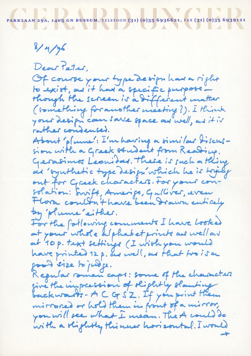 In 1996, I was a student in Paris, and struggled with my first text typeface. I had many doubts. That’s when I approached Gerard Unger. 1/4