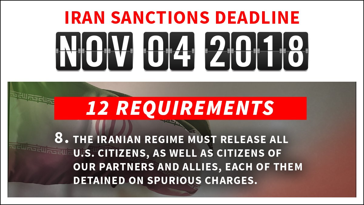 There are 8 days until the November 4 sanctions deadline. Here is the 8th requirement for the regime: the Iranian regime must release all U.S. citizens, as well as citizens of our partners and allies, each of them detained on spurious charges.