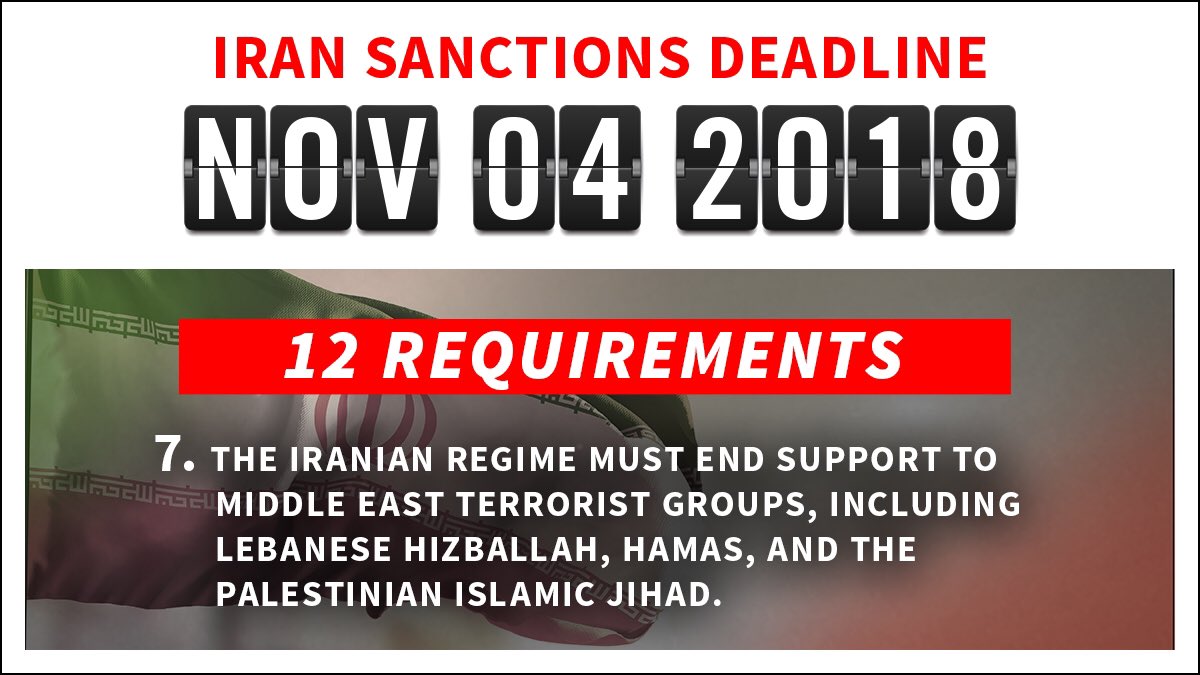 7 days from today, sanctions will be reimposed on ’s regime. Here’s a reminder about the 7th requirement for the regime to behave like a normal state: it must end support to Middle East terrorist groups, including Lebanese Hizballah, Hamas, and the Palestine Islamic Jihad.