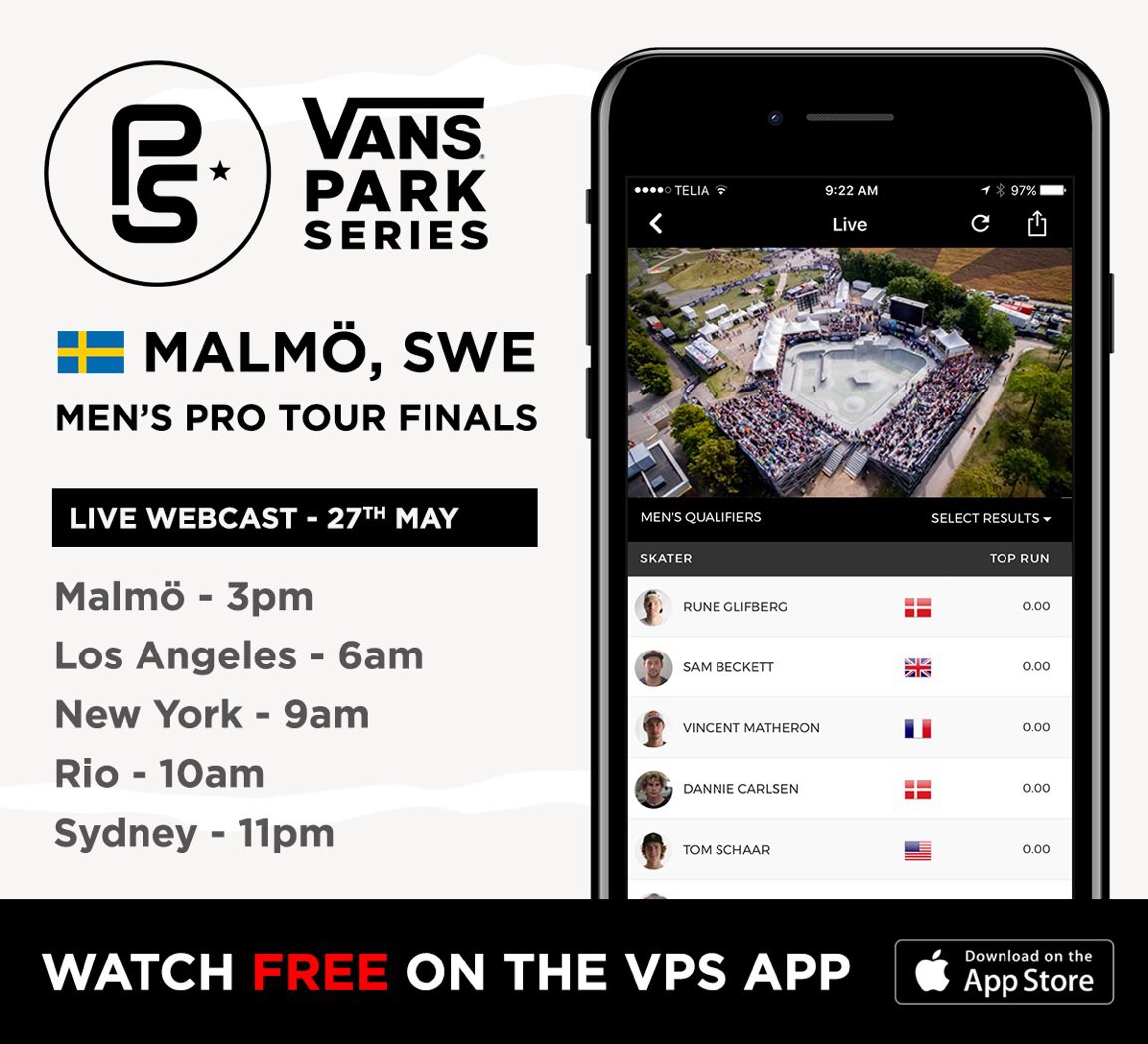 the next stop of the VPS Tour is in Malmo Sweden! It will be live May 27th on http://redbull.tv & http://vansparkseries.com