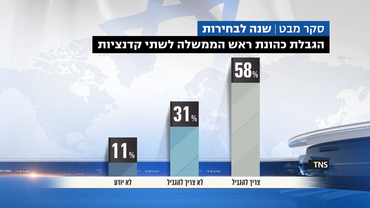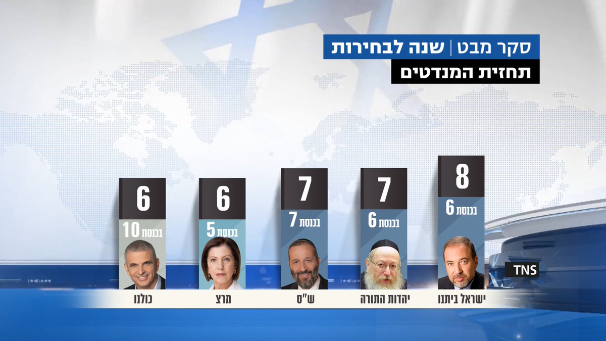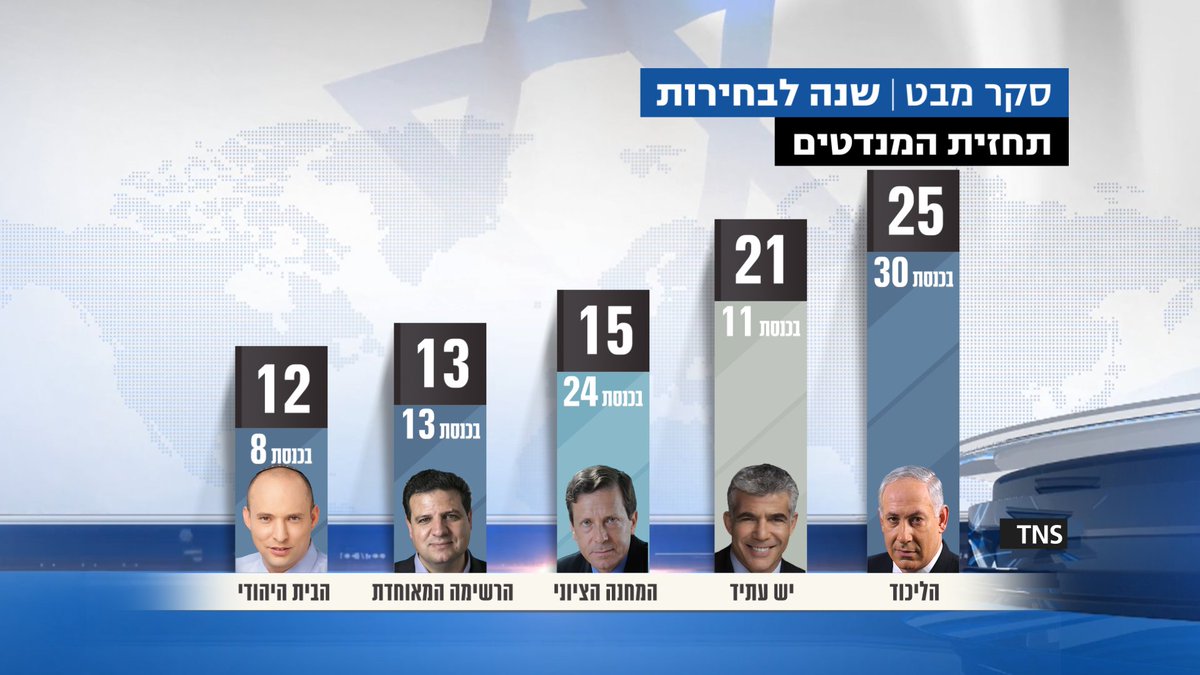 20. תוצאות סקר מבט: ימין וחרדים 59 מנדטים, שמאל מרכז וערבים 55, "כולנו" לשון מאזניים עם 6. "יש עתיד" קופצת ל21 מנדטים