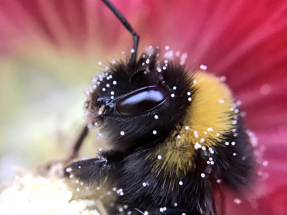 This guy caught my eyes with his abdomen full of pollen.🐝It was like a drunk.Easy for a close-up on its eyes.