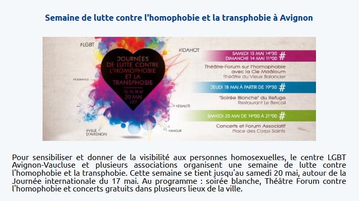 Journée internationale de lutte contre l'homophobie et la transphobie : sélection d'événements http://uvyk.mjt.lu/nl2/uvyk/0h02.html …