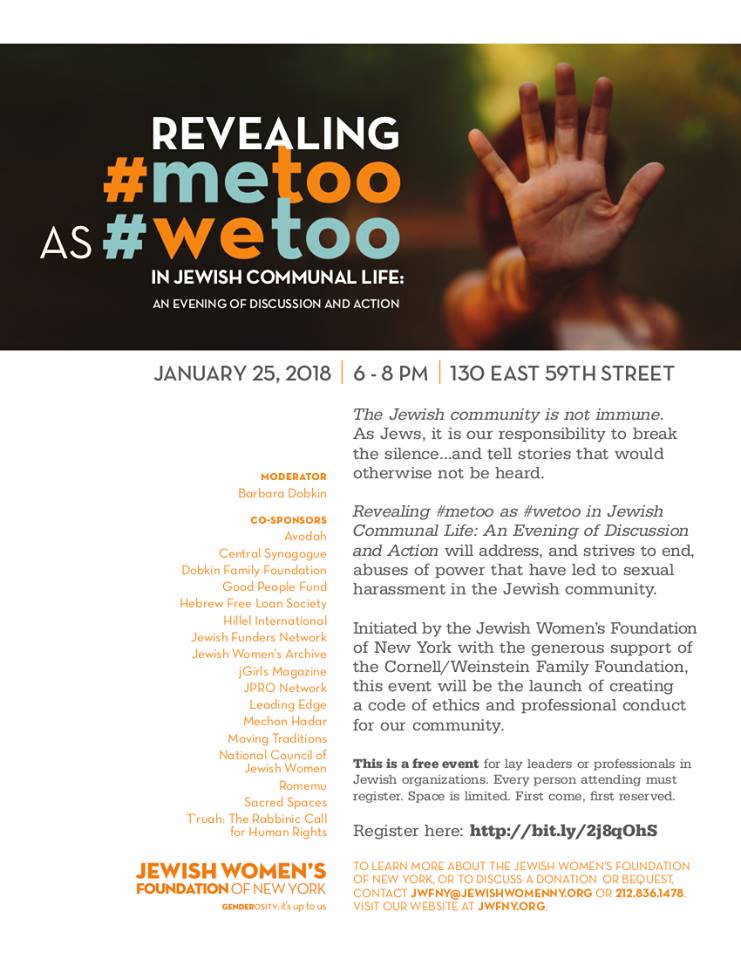 A powerful evening you won't want to miss... presents As in Jewish Communal Life: An Evening of Discussion and Action, co-sponsored by . Jan. 25, 2018, 6-8pm; 130 East 59th St., NYC