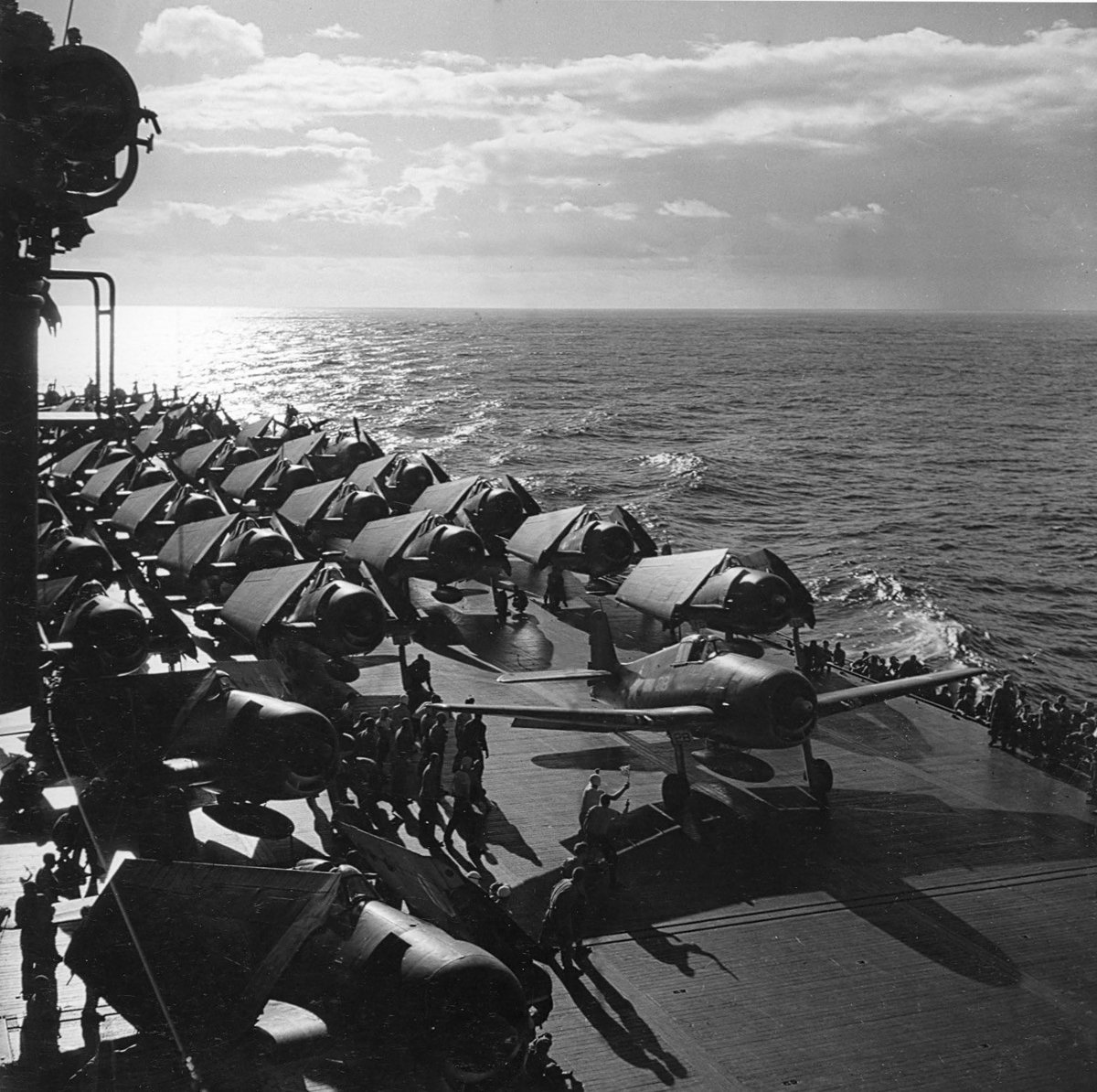 F6F-3 Hellcat fighters preparing for launch aboard USS Saratoga.