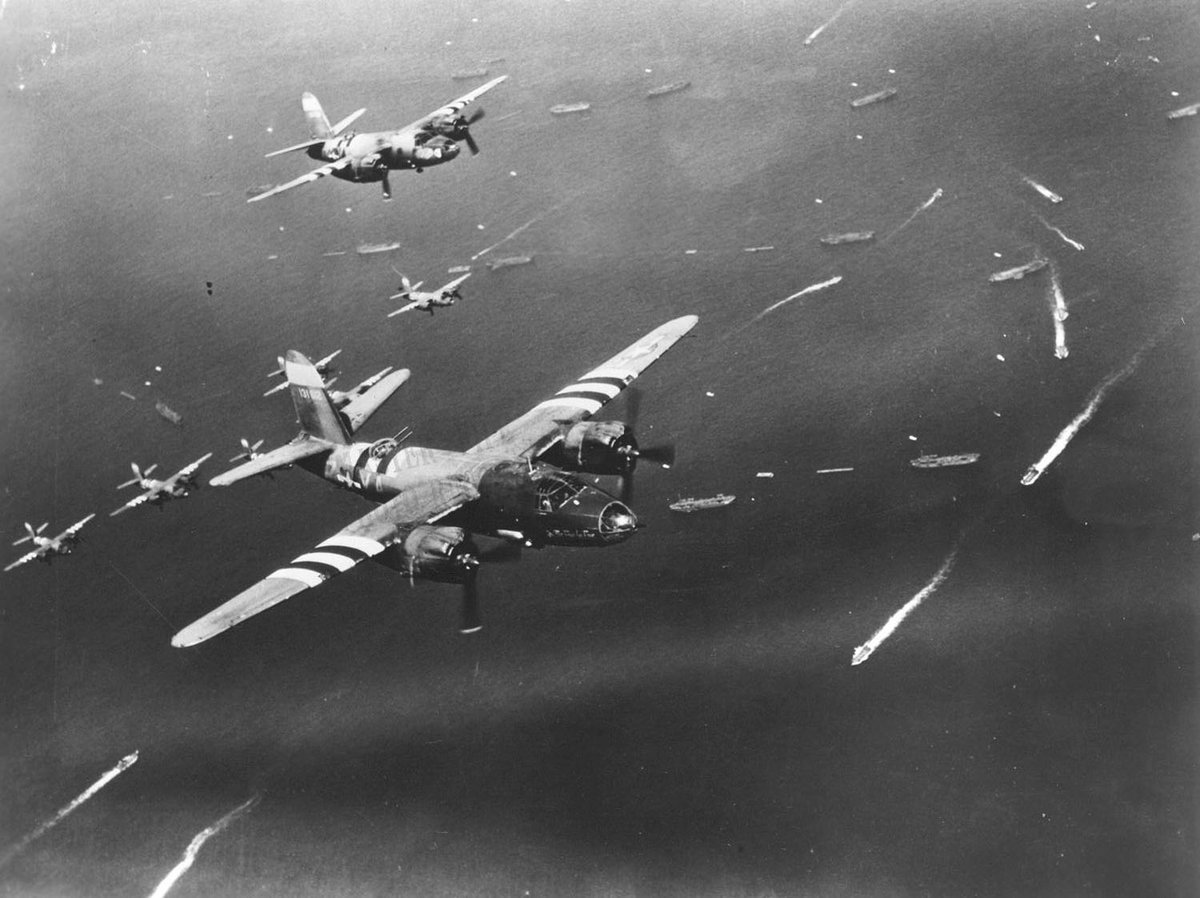 A formation of Martin B-26Bs in Invasion Stripes over the Channel, June 26, 1944.