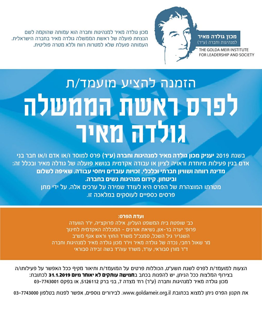 פרס ראשת הממשלה גולדה מאיר 2019. מוזמנים להציע מועמדות ולשתףpic.twitter.com/fqw7p1Vojx