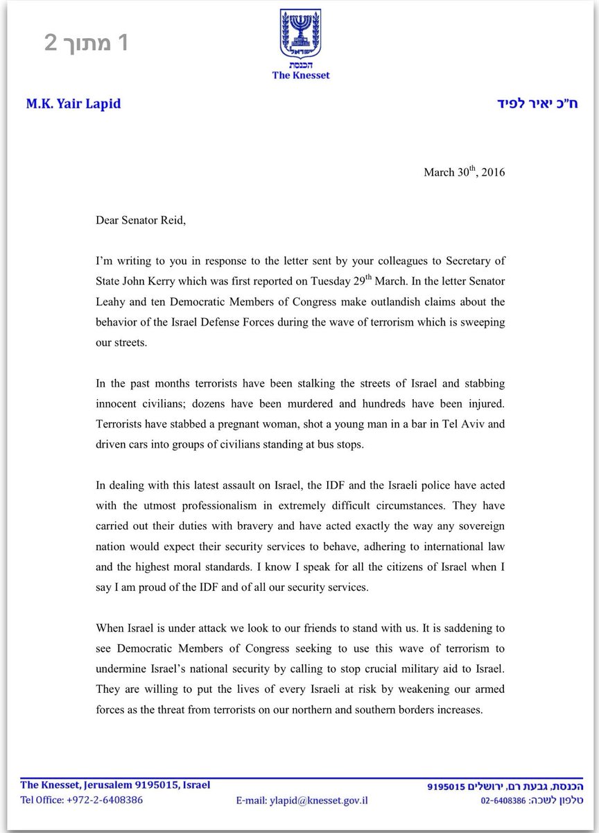פניתי ליור המפלגה הדמוקרטית, הארי ריד, בבקשה להתנער בתוקף ממכתב הסנטור וחברי הקונגרס על הפסקת הסיוע הביטחוני לישראל.pic.twitter.com/HdoudSp4qG