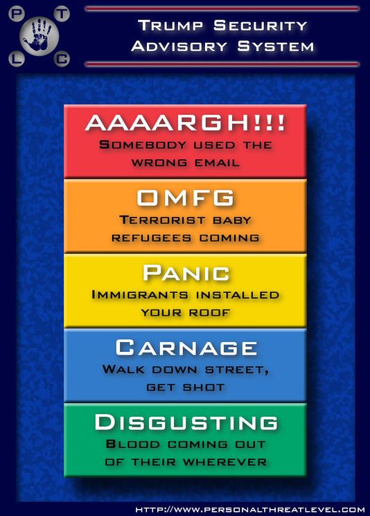 I have obtained a draft of the White House's new threat level warning system. As you can see, we're at all the levels.