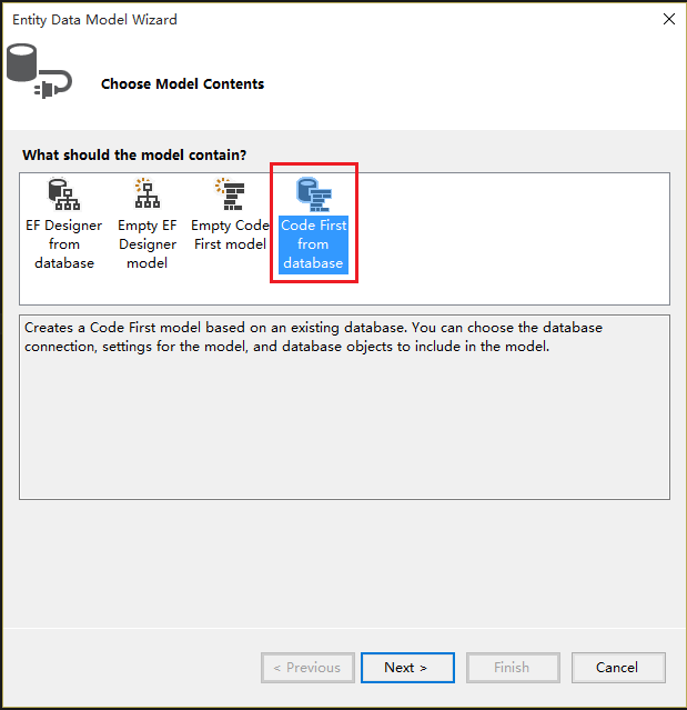 6.In the Entity Data Model Wizard window, select the item Code First from database.