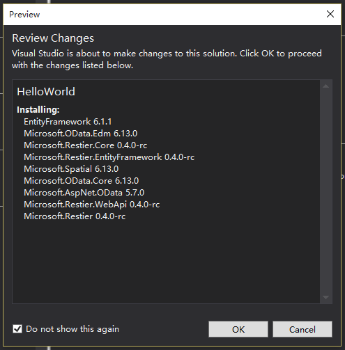 WebApiConfigclass the following code.using System.Web.Http; using HelloWorld.Models; using Microsoft.Restier.Providers.EntityFramework; using Microsoft.Restier.Publishers.OData; using Microsoft.Restier.Publishers.OData.Batch; using Microsoft.Restier.Publishers.OData.Routing; namespace HelloWorld { public static class WebApiConfig { public async static void Register(HttpConfiguration config) { await config.MapRestierRoute<EntityFrameworkApi<AdventureWorksLT>>( "AdventureWorksLT", "api/AdventureWorksLT", new RestierBatchHandler(GlobalConfiguration.DefaultServer)); } } }Note : DbApi was renamed to EntityFrameworkApi from version 0.5.