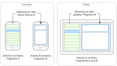 Android has long offered a similar mechanism in resource directory qualifiers. This extends to many different types of resources (layouts, images or ‘drawables’, styles, dimensions, etc). Thus you can customize the view hierarchy as well as styling depending on device form factor, A base set of layouts for handsets can be extended for tablets by placing additional layouts in res/layout-xlarge or res/layout-sw600dp (smallest width 600 density-independent pixels) directories. Note that the latter syntax requires Android 3.2 or later.