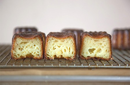 So, now, when all your canelés bake up just as perfectly as you want them, remove the baking sheet from the oven. With a pair of tongs or a glove, pick up a mold, turn it upside-down and tap it gently, your canelé should fall right out. Let them cool down a bit over a wire rack before you chomp into them or you’ll be sorry. The canelés are at their perfectest perfect within a few hours after they’re out of the oven. They’re still good long after that, but the crust will soften and so they won’t be at their best any longer than that.