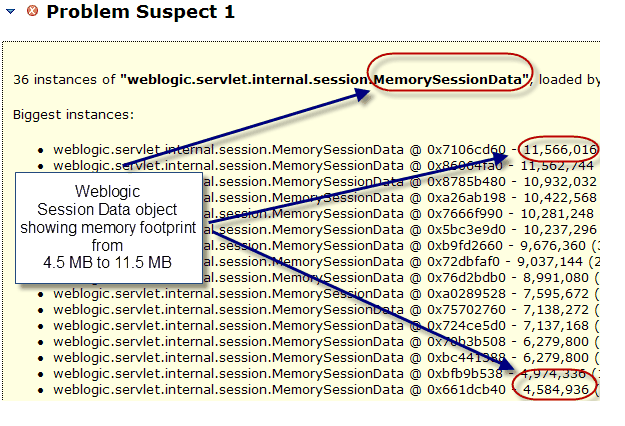 The next step is to scroll down and have a closer look at your leak suspects. As you can see in our example below, the primary problem is that our Weblogic Session Data (client HttpSession object) is showing a footprint between 4.5 MB – 11.5 MB; much larger than the original size before this application change (~ 1 MB).