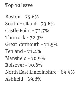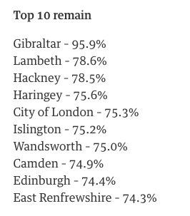 8. With over 90% of results reported, these are the areas that voted most in favour of leave or remain