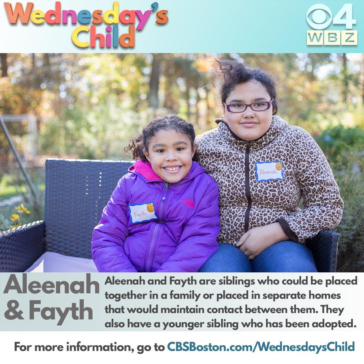 Sisters Aleenah & Faith are this week’s Wednesday’s Children. Can you help them find a place to call home? http://cbsloc.al/2fNw4Xe pic.twitter.com/oB6n5BYc4U