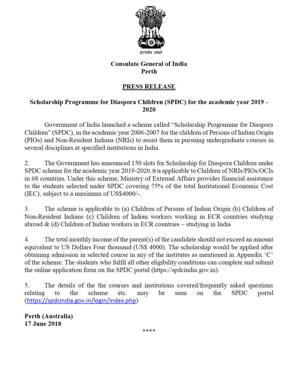 Press Release: Scholarship Programme for Diaspora Children (SPDC) for the academic year 2019 -2020pic.twitter.com/ErBX53VB6f