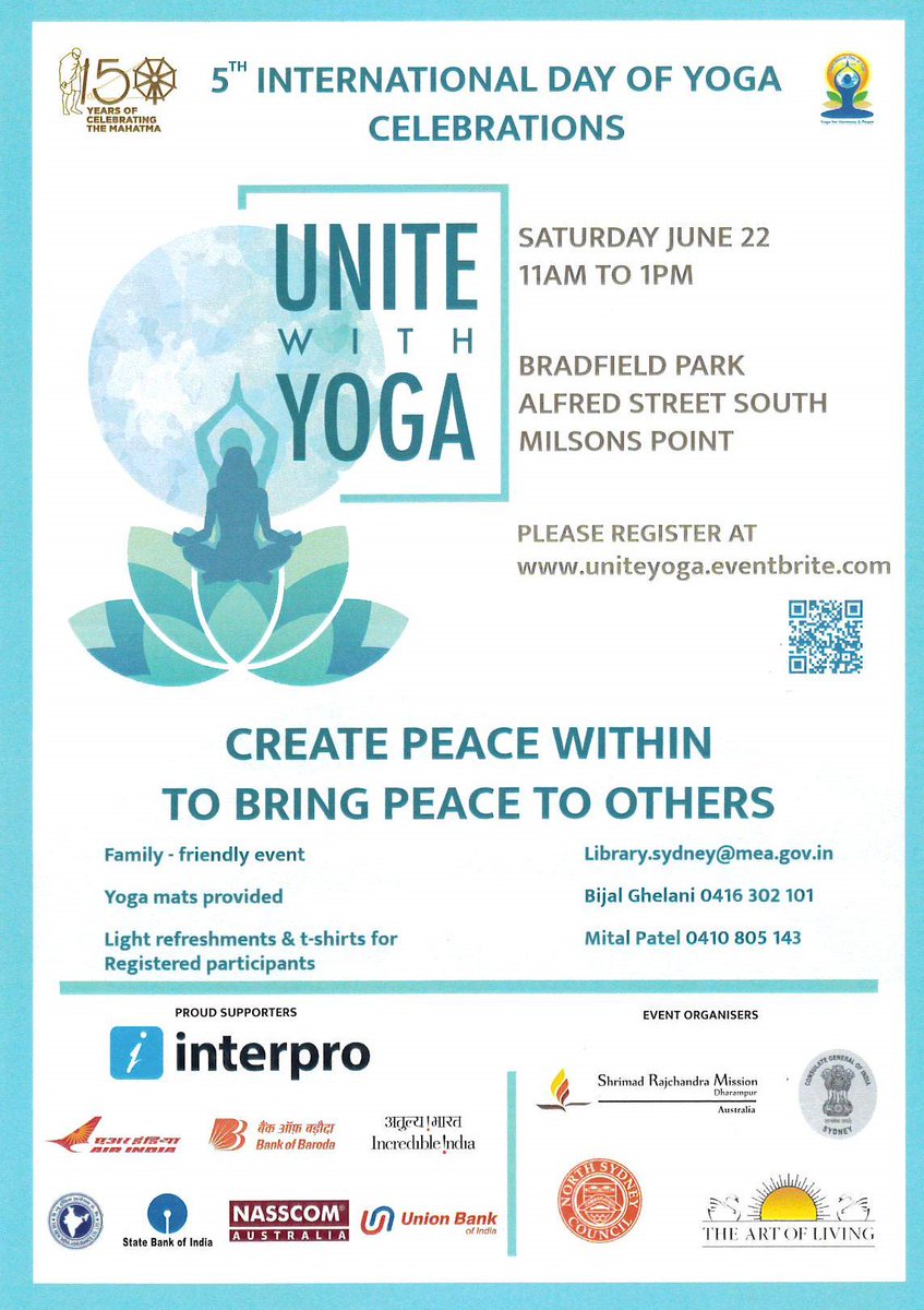 Please join us in celebrating 5th International Day of Yoga on 22nd Jun 19 frm 11AM to 1PM at Bradfield Park, Milsons Point, organised in association with Shrimad Rajchandra Mission Dharampur Australia and The Art of Living, Sydney. Register at http://www.uniteyoga.eventbrite.com
