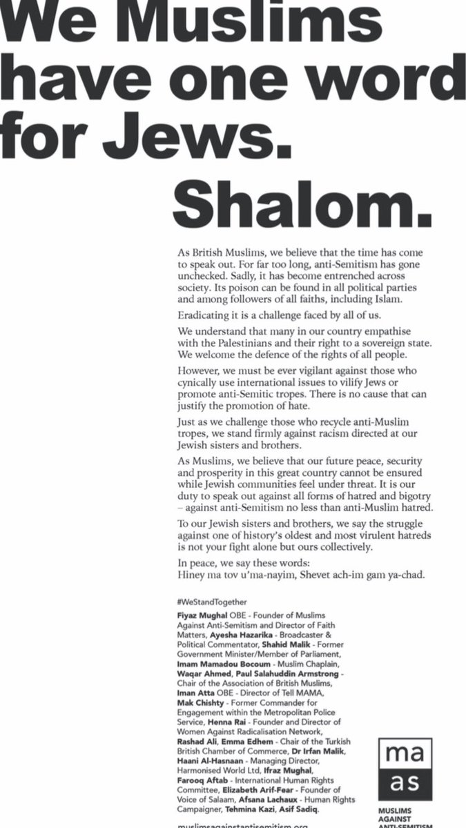 Incredible solidarity - a full page ad by Muslim sisters & brothers in today's . Thank you. Together we will defeat the twin evils of antisemitism & anti-Muslim hate.