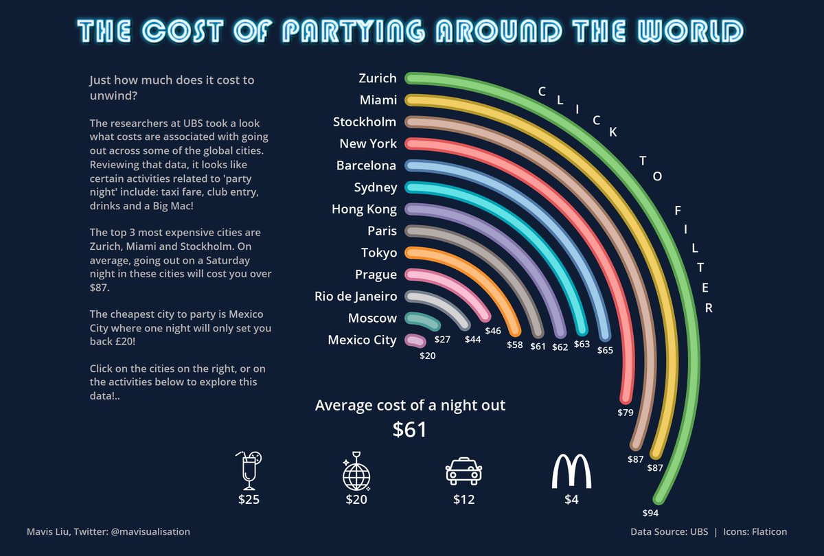 #MakeOverMonday, looking at how much it costs to party in some of the global cities in the world. I was keen to try and get in some bright colours for this one! https://public.tableau.com/views/TheCostofaNightOut-MakeOverMondayWeek48/Costofpartyingaroundtheworld?:embed=y&:display_count=yes&publish=yes …pic.twitter.com/gOE94SPPmv