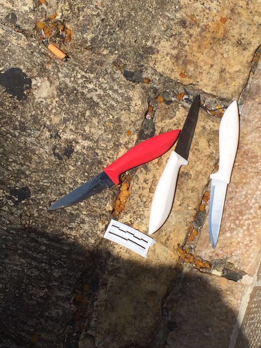 המחבל הירדני החזיק סכין בכל יד וסכין שלישית בכליו. רץ אל השוטרים וצעק אללה אכבר. צילום: משטרהpic.twitter.com/TBQbTZUEmx