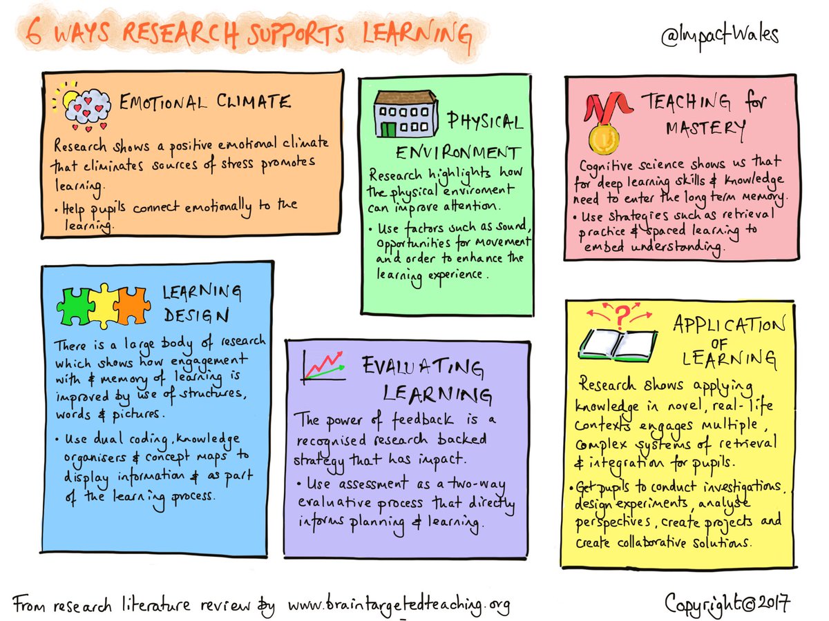 6 Ways Research Supports Learning. Our sketchnote on actions every teacher can take to improve outcomes