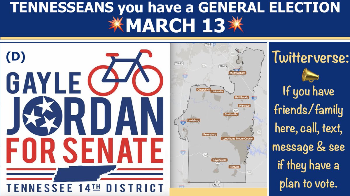 #Tennessee#SpecialElection Dist 14: Rutherford, Moore, Marshall, Lincoln, & Bedford Counties#FlipitBlue#AtTheStateHouseToo Follow Dem Gayle Jordan@Jordan4SenateTN