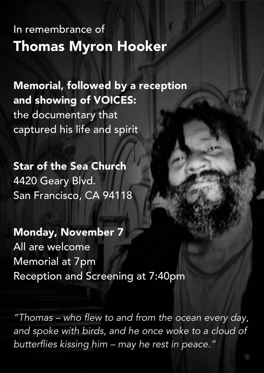Neighbors: remember Thomas Hooker tonight 7PM-Star of the Sea Church (8th/Geary) Followed by VOICES doc about Thomas http://www.sfchronicle.com/bayarea/nevius/article/Homeless-man-leaves-legacy-of-kindness-10595055.php …pic.twitter.com/yoHCGMv6iV