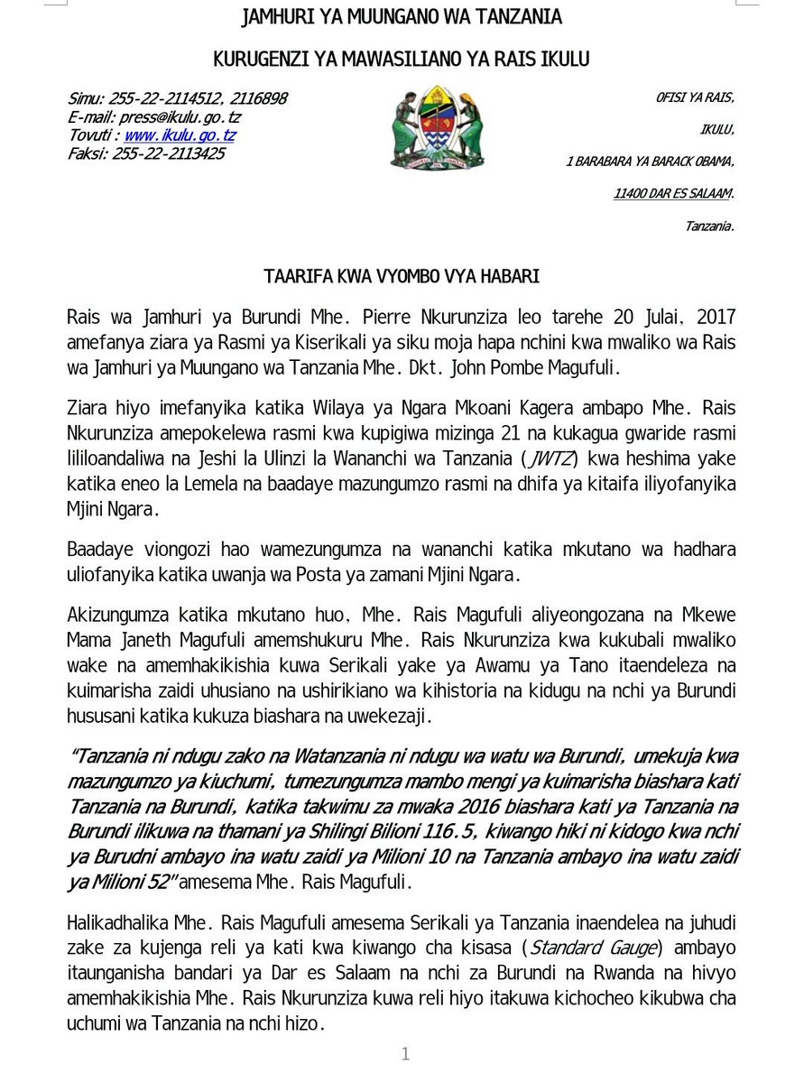 Rais Pierre Nkurunziza amemaliza ziara Rasmi ya Kiserikali ya siku 1 kwa mwaliko wa Rais Magufuli leo, tayari amerejea nchini kwake Burundi.pic.twitter.com/Q4V14Rpq6j
