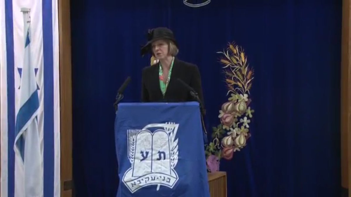 תרזה מיי, בכיסוי ראש, נמנעת מלחיצת יד לרב, מתבלת נאומה במילים בעברית, באירוע יום העצמאות של בני עקיבאpic.twitter.com/ozTjUzauk6