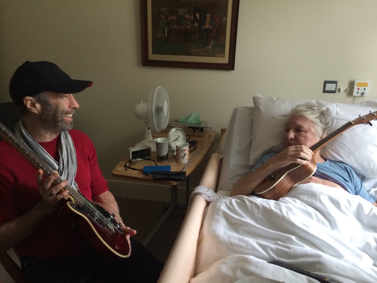 @realmickralphs on ukulele and me on a mini May guitar very kindly given to Mick by@DrBrianMay . - Paulpic.twitter.com/mEWfZq2zxZ