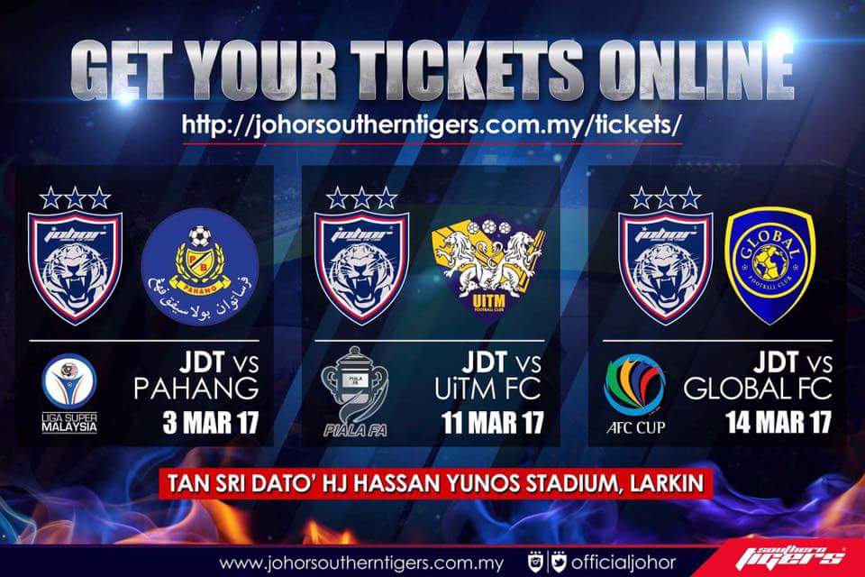 You can now get tickets online at http://johorsoutherntigers.com.my/tickets/ to watch JDT matches at the Tan Sri Dato Haji Hassan Yunos Stadium, Larkin.pic.twitter.com/kFUYVNVgjb