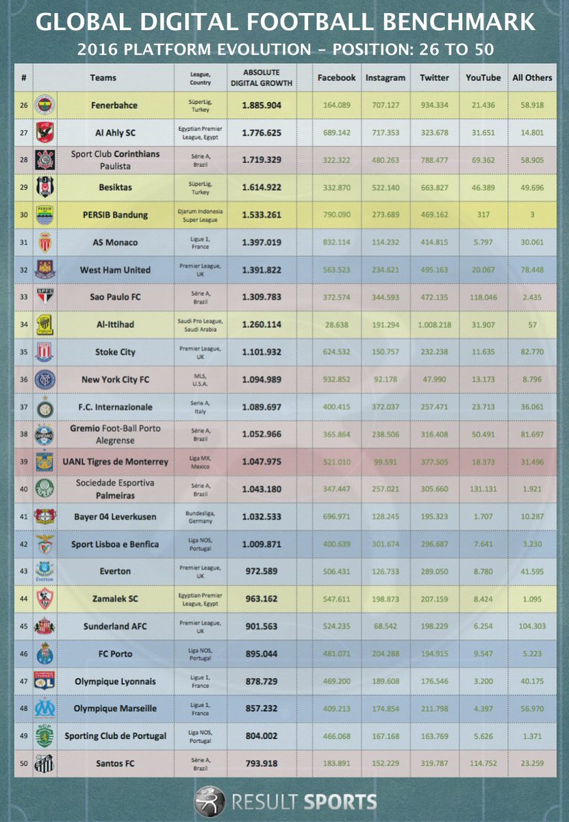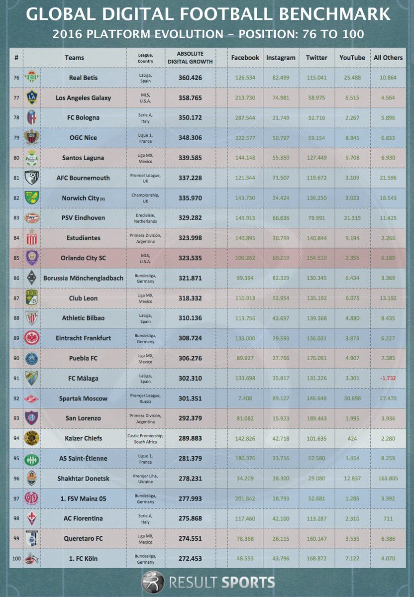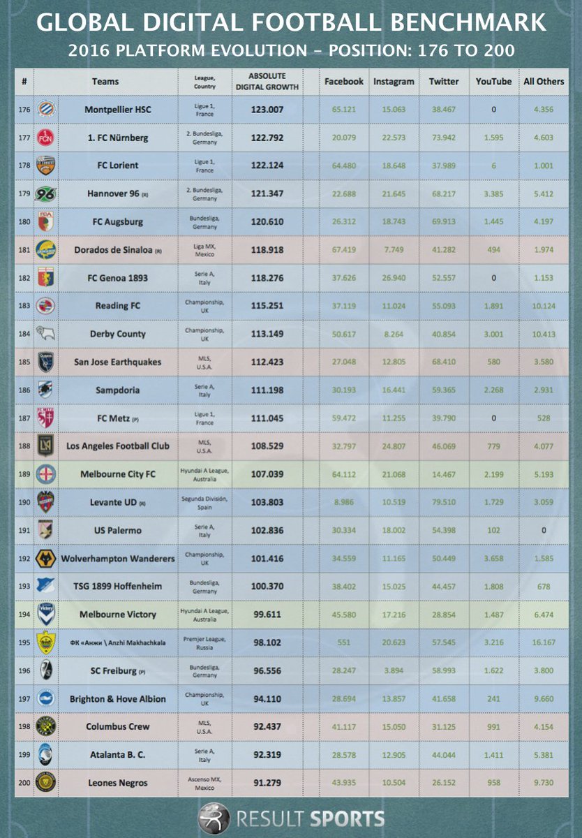 Part 4 - Global Digital Football Benchmark, pos. 101 to 125. Growth >200k Followers in 2016, incl.