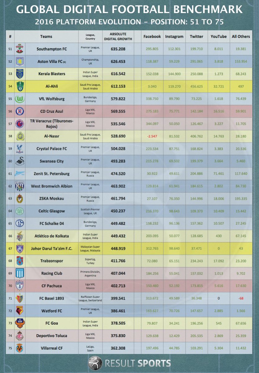 Global Digital Football Benchmark, clubs ranked 51to75. Starting