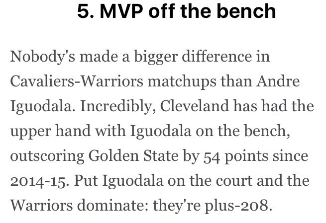 אין בעשור האחרון שחקן ששמר את לברון ג׳יימס טוב כמו אנדרה איגודלה. יכולת הגנתית טובה שלו היום נגד קליבלנד קריטית לגולדן סטייט בדיוק כמו יכולת התקפית של דוראנט. הנה נתון שמפרסם espn לקראת המשחק, אשר ממחיש זאת בצורה הטובה ביותרpic.twitter.com/FWmeuIa17y