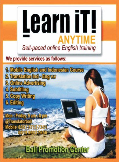 We render translating service from Indonesian - English V.V .Give Added Value - Free Business Promotion . Terms and Conditions Apply Layanan jasa penerjemahan Indonesia-Inggris v.v. dengan Bonus jasa promosi untuk bisnis anda. Ketentuan dan Syarat Berlaku