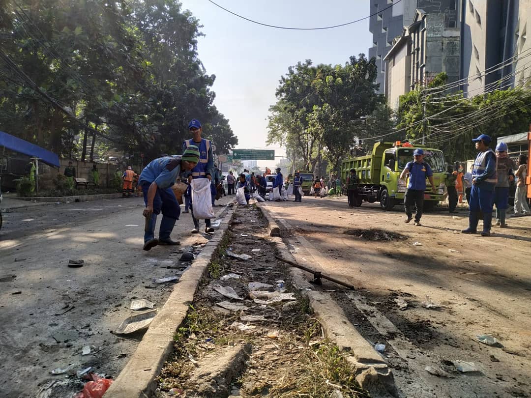 Kondisi terkini di Kawasan MH. Thamrin. bergotong royong untuk membersihkan sampah sampah yang tersisa pasca aksi di Jakarta Pusat. Dikerahkan 8 Kecamatan untuk dapat membantu menangani sampah tersebut. (23/05/2019) . . 🍭 MH. Thamrin Jakarta Pusat
