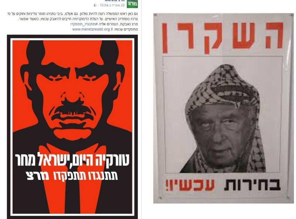 בדף פייסבוק של מרצ: דמותו של ראה'מ בדמיון מדהים, עם השפם, לארדואן ואולי גם לצורר. פירסום מביש ונקלה של מרצ.