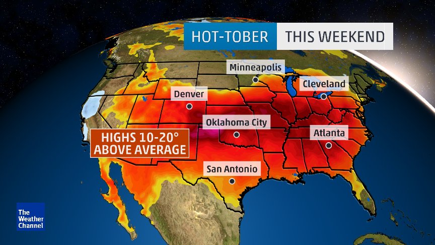 #heat is on the way to end October from the Southwest into the Plains and Southeast. Latest forecast: http://wxch.nl/2ePCGCC pic.twitter.com/vbGxf1aO5g